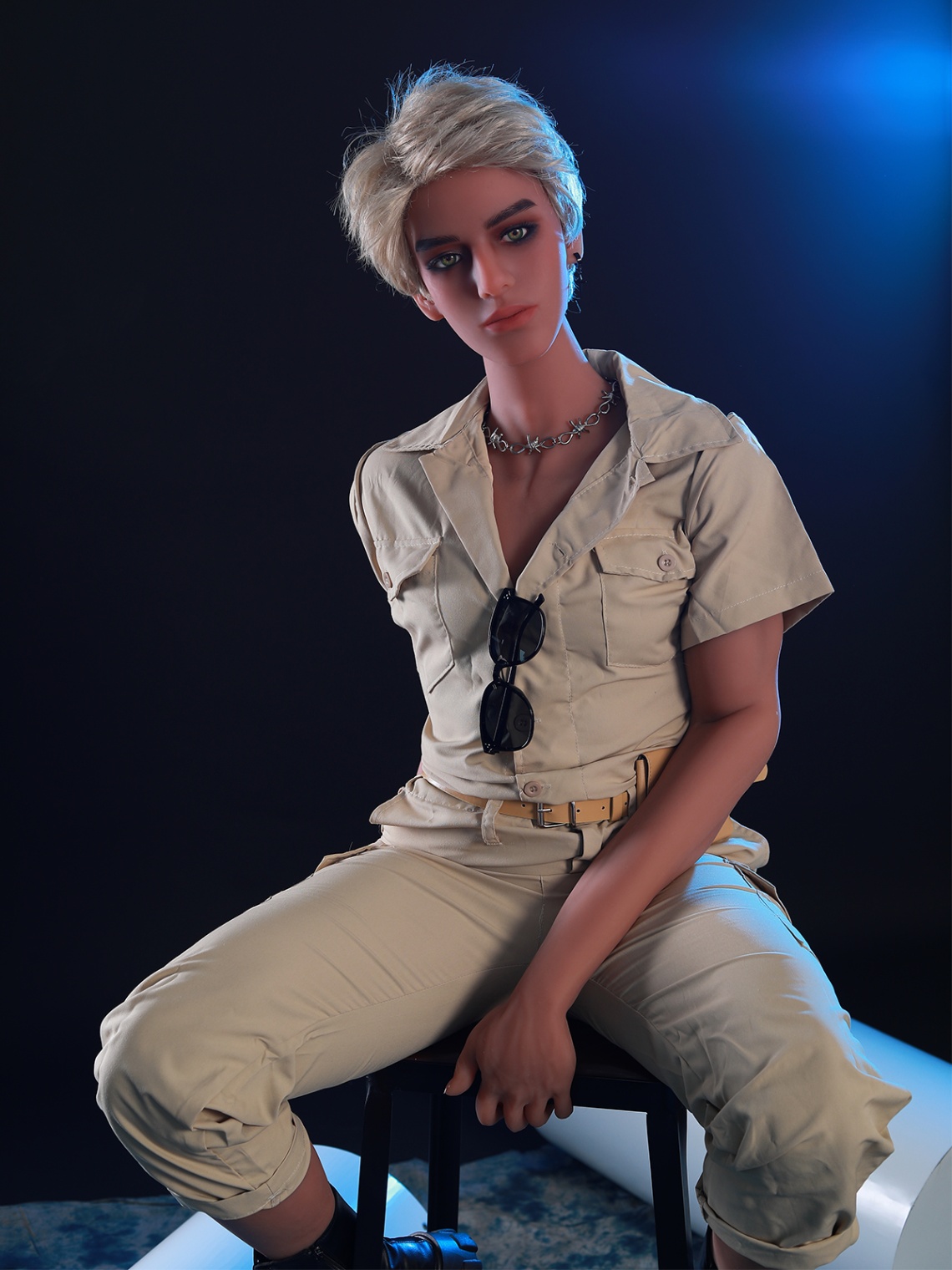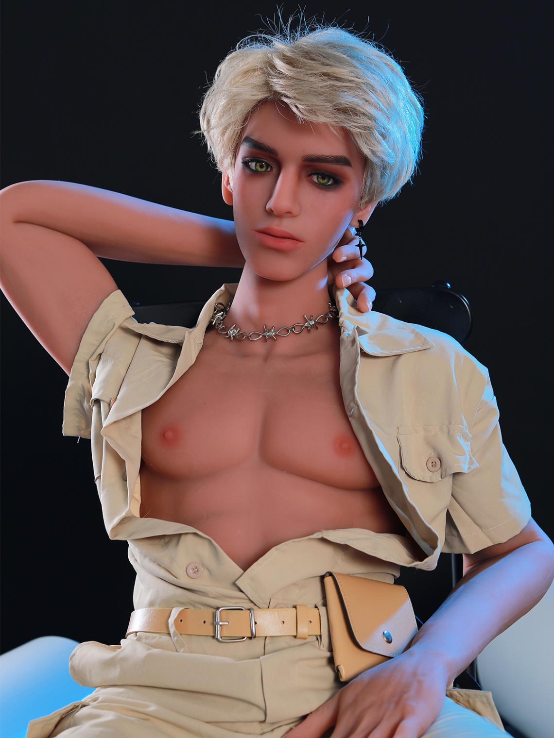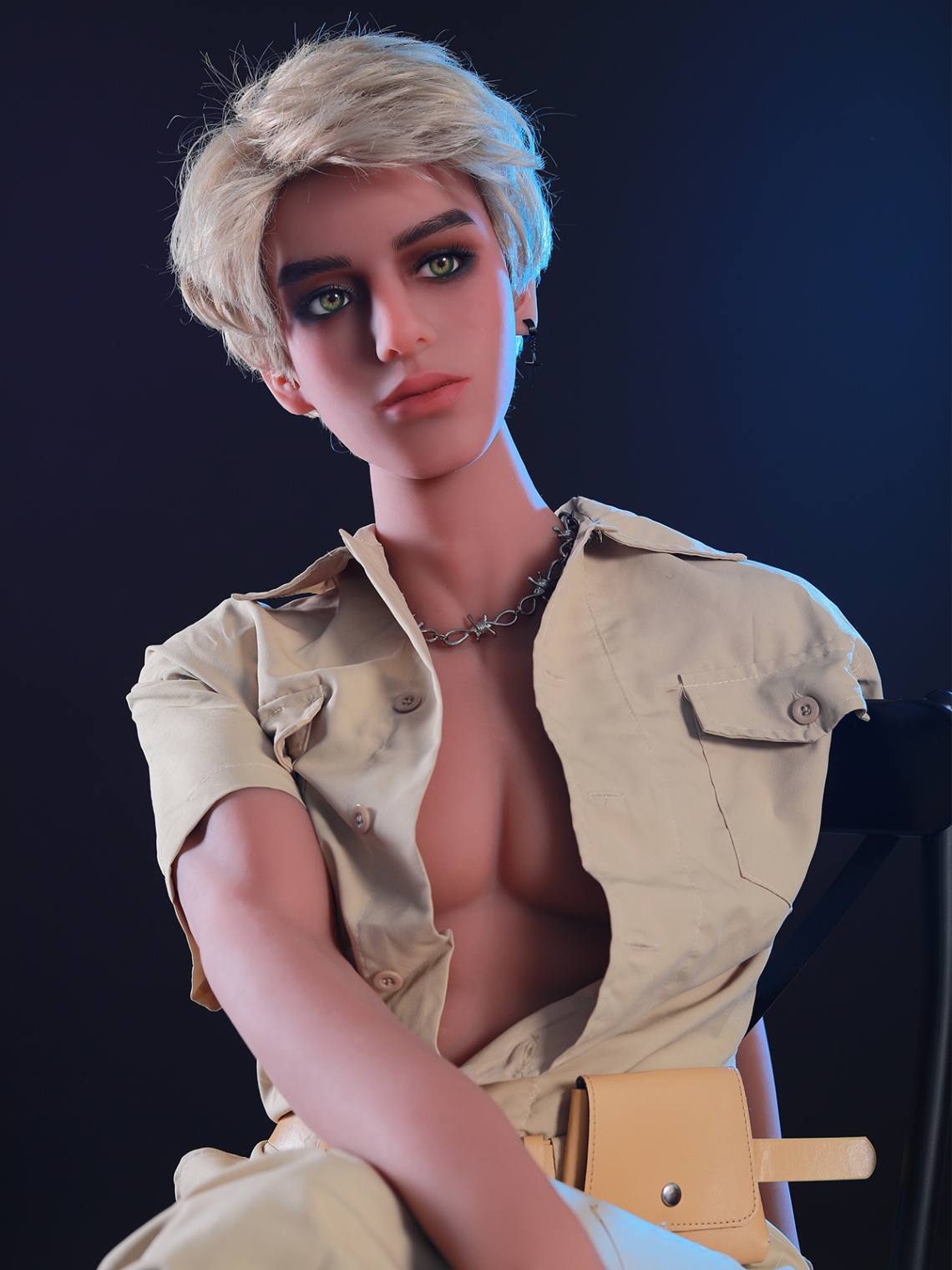 Spill the tea: Ready to remix reality? Your Young-Looking Male Sex Doll is the chameleon of carnal creativity, morphing moods with minimal fuss. Channel his photo-op flair: Khaki shirt shrugged off shoulders, belt slung low on hips, pouch peeking like a promise. Blonde hair? Tousle it wild for beach-bum bliss or slick it for sleek sophistication. Add-ons? Spike the earrings for punk prowess or swap the necklace for a collar of your choosing.