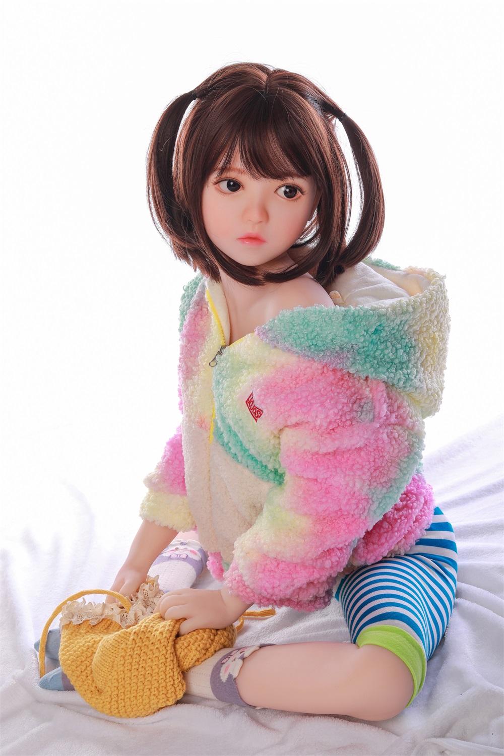 Ooh la la, daydream dynamo! Plunge into a pop-art playground with a Cute Anime Sex Doll that’s dinkier than a dorayaki but detonates a dazzle of delightful drama that’ll dance your daydreams into delirium. This 13kg net weight whimsy-wisp (fluffier than a furikake flurry, friend!) flings open the floodgates to a young-looking reverie where natural skin sparkles like stardust on a storyboard, dark brown pupils ponder with pint-sized profundity, and light brown bangs hair (with a shadowy sidekick!) curtains her countenance like a clandestine chibi chronicle. Ditch the daunting diva dimensions here—just a dainty 55 cm bust (medium and magically modest), 37 cm waist (willow-wisp wonder), and 58 cm hips hushed in a humdrum 92 x 28 x 19 cm carton that’s as riveting as recycled receipts. In the kaleidoscopic kale of kinky knick-knacks, where anime artistry is the alchemist’s ace for affection amplification, this Cute Anime Sex Doll capers in with standing feet that frolic like a festival float, a rainbow-hued hoodie and striped shorts ensemble that’s equal parts endearing and edgy, and that timeless tot temperament trilling “teenage tanuki tease!” Whether you’re a frothy fledgling fumbling at frilly fantasies or a polished pixie pursuing that “petite with pizzazz,” this 13kg jewel is juiced to jazz up your jaunts with jitters and joy. Nestle near, nugget—we’re nibbling the nuances, nips, and naughty nuggets that’ll nab you nimbler than a ninja’s nod!